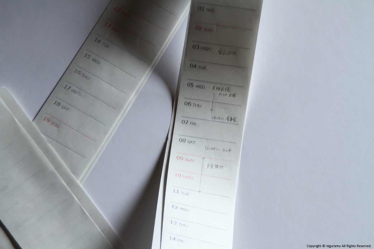 レジスターで印刷されたドット文字と細長が特徴のカレンダー。1ヶ月ごとにカットして使用します。1ヶ月の連続したスケジュールを縦に記載できるので、重複した予定も見やすく便利です。