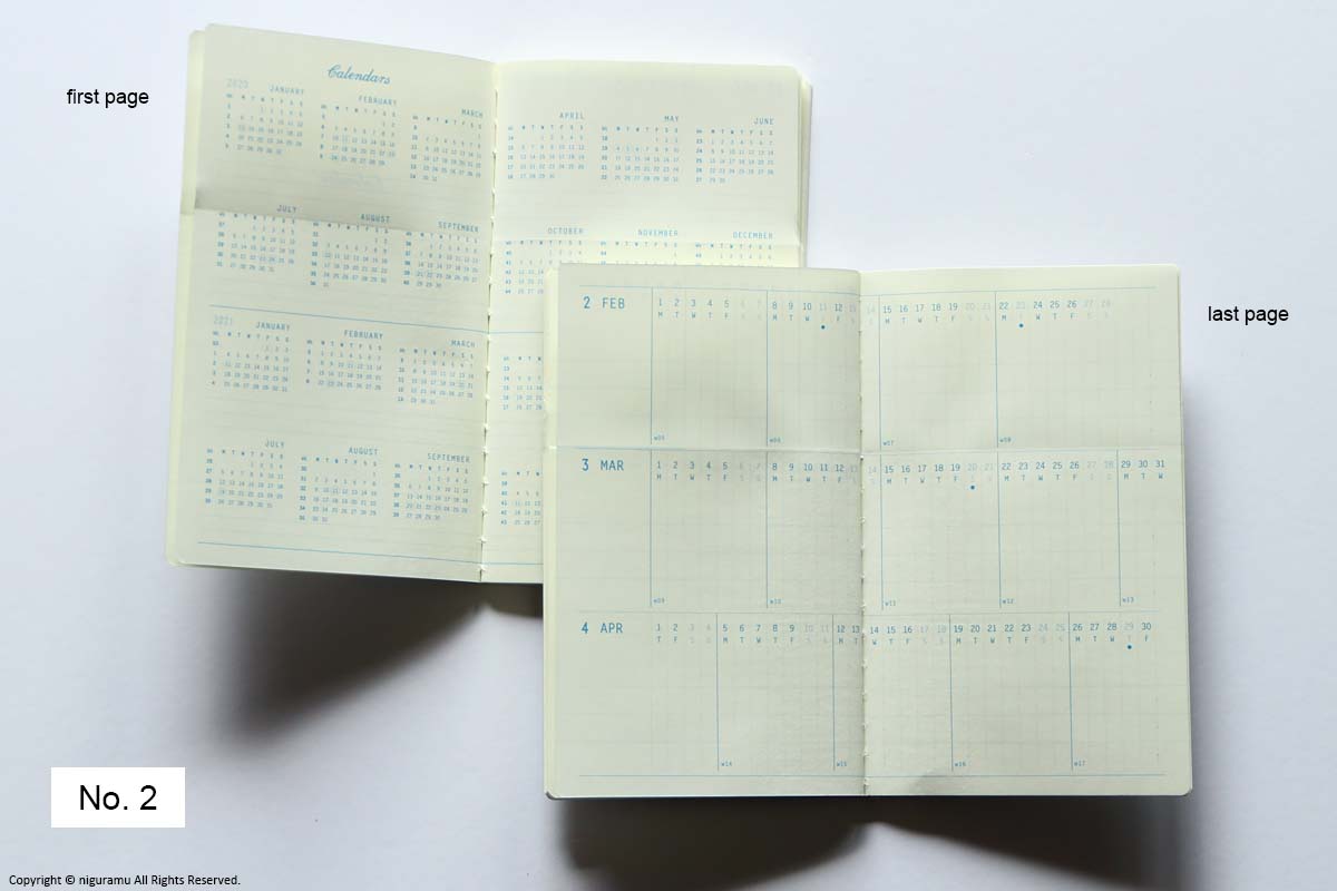 手帳は上半期と下半期の2冊セット。上段の1か月のスケジュールを見ながら、下段の週間スケジュールをめくる事ができます。下半期分の見開きには2年間のカレンダーが、最後のページには2021年2月~4月までの簡易カレンダー付きです。