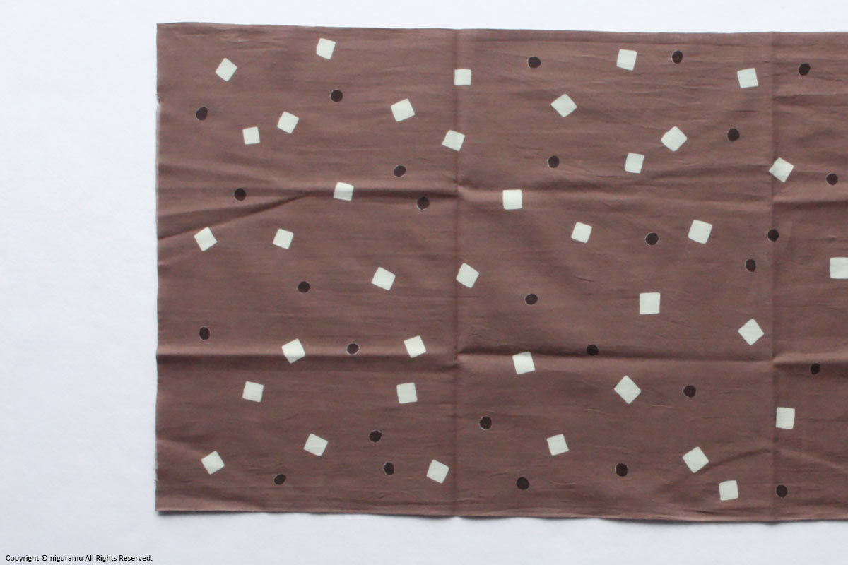 - It is dyed by using the method called “Chusen” or injection dyeing, where the “resist dyeing glue is spread over the cloth using dye, and then the dyestuff is poured from above the folded cloth material. According to the trait of the dyeing method, some color unevenness or irregular oozing may occur.