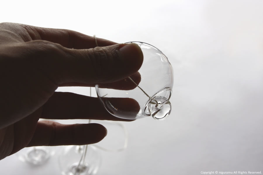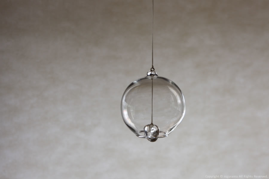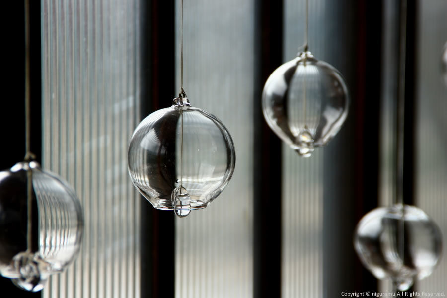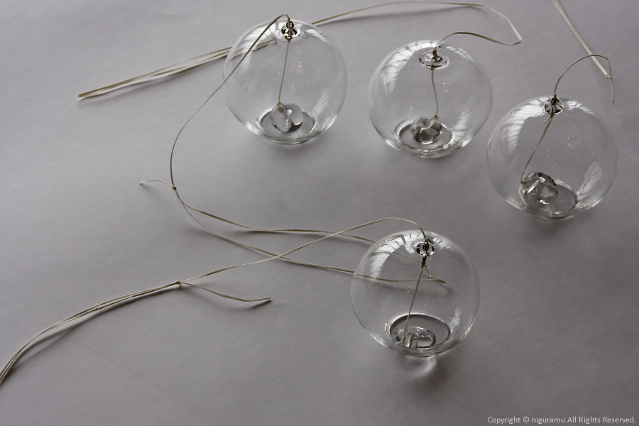 The artist Moritani uses a burner to create the blown glass spheres, each of which has a slightly different shape and size. The length of the string used to hang them varies from about 250 to 350 mm. -