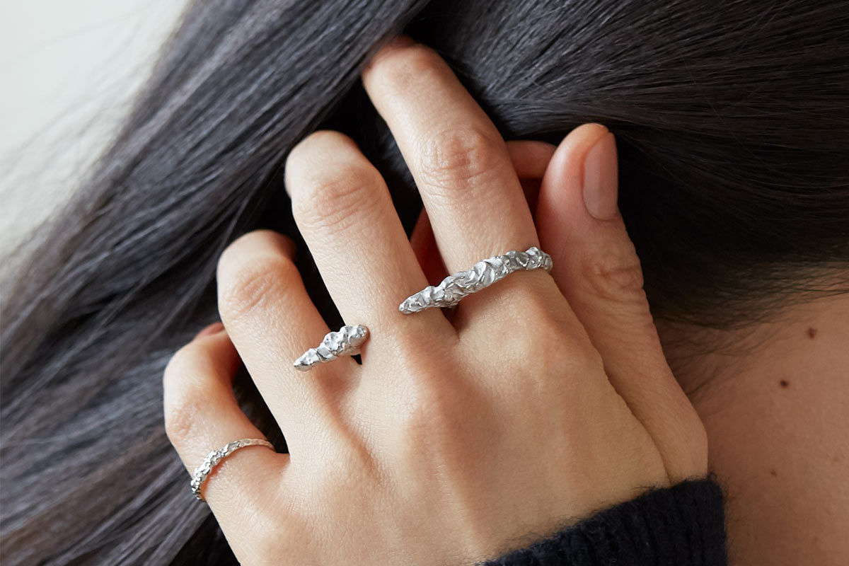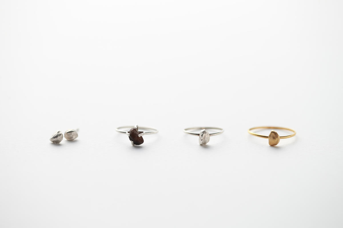 熱く溶け出したマグマが冷えて固まったような柔らかさと力強さ、偶然生まれた巨大なエネルギーの欠片を表現。マットな質感のシルバーやゴールドは、ランダムに、控えめに光を湛えます。