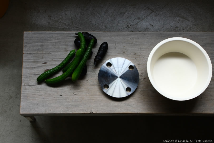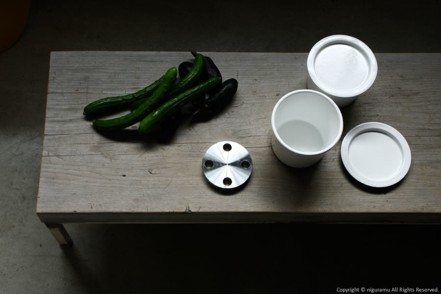中くらいの鍋や、陶器製のおひつを利用して、ちょっと多めの浅漬けを作るのに丁度良い大きさです。ナスなど、しっかりした重石が必要な場合は、何枚か重ねて使用してください。1枚の厚みが16mmなので、陶器製重石の半分程度の容積で済むのも嬉しいところ。