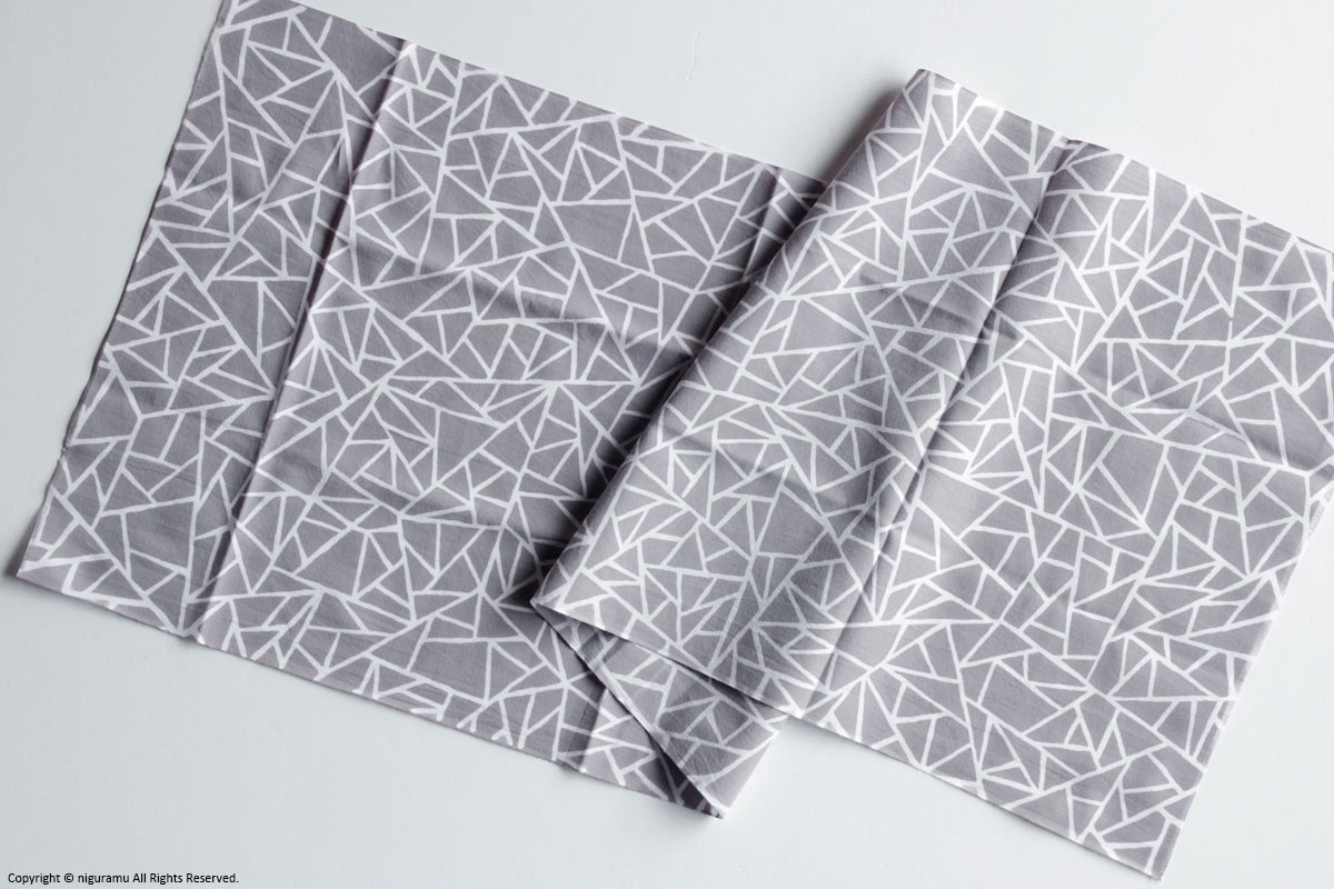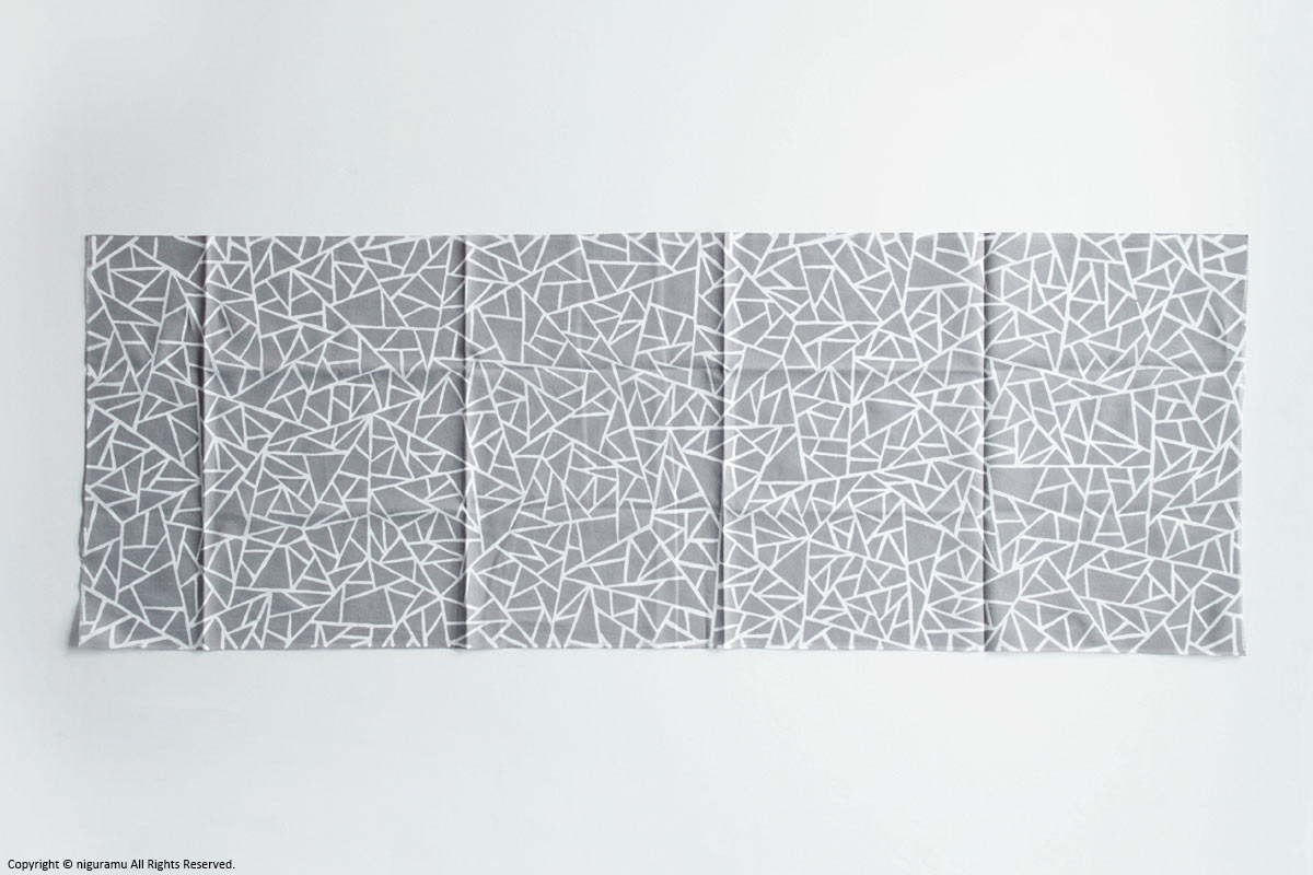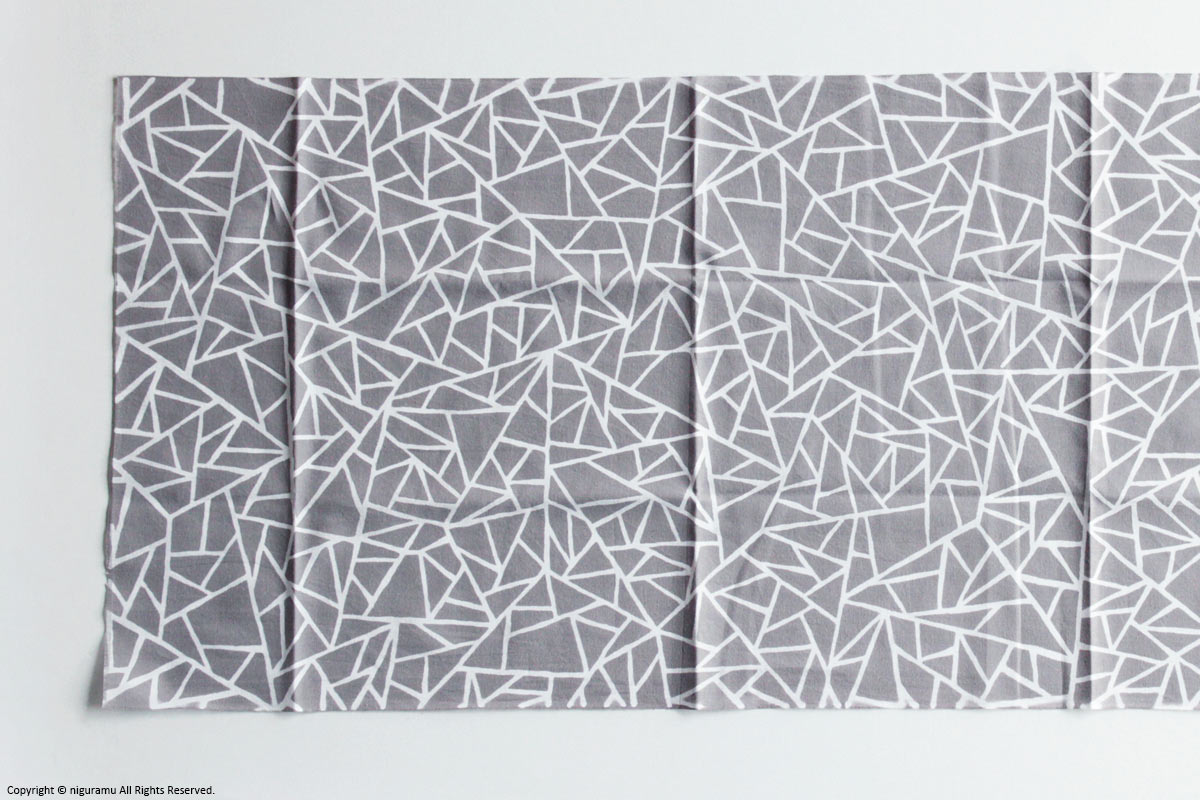 - 注染(ちゅうせん)という「型を使って布に防染糊を置き、たたんだ生地の上から染料を注ぐ」という方法で染められています。染めの特性上、若干の色ムラや柄のにじみがあります。