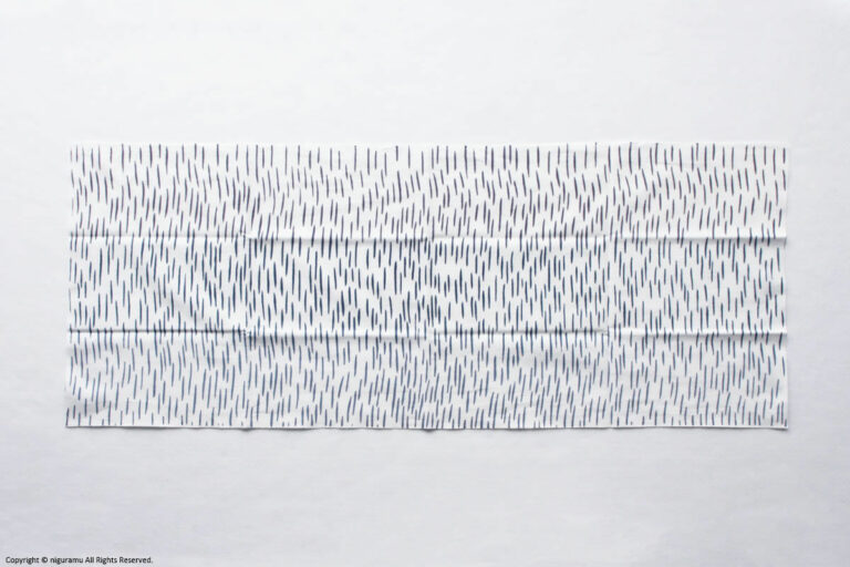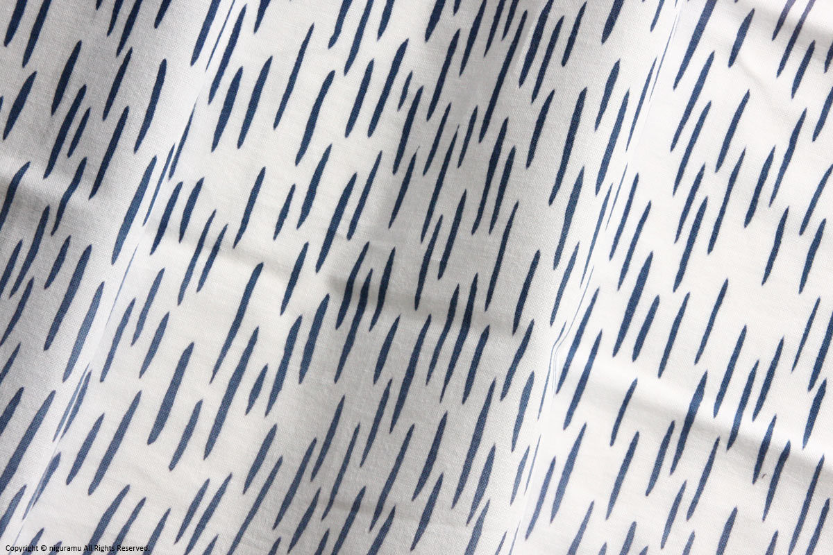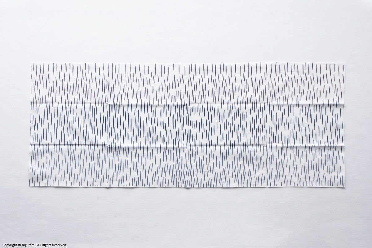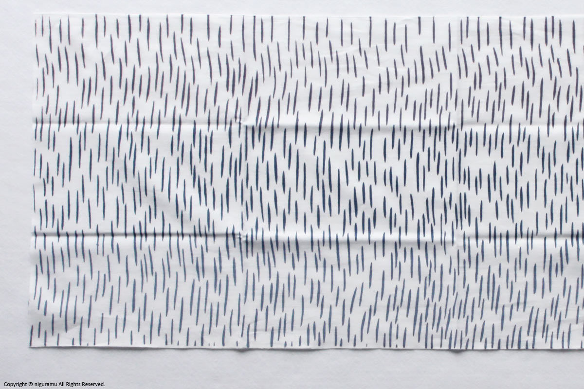 - 注染(ちゅうせん)という「型を使って布に防染糊を置き、たたんだ生地の上から染料を注ぐ」という方法で染められています。染めの特性上、若干の色ムラや柄のにじみがあります。