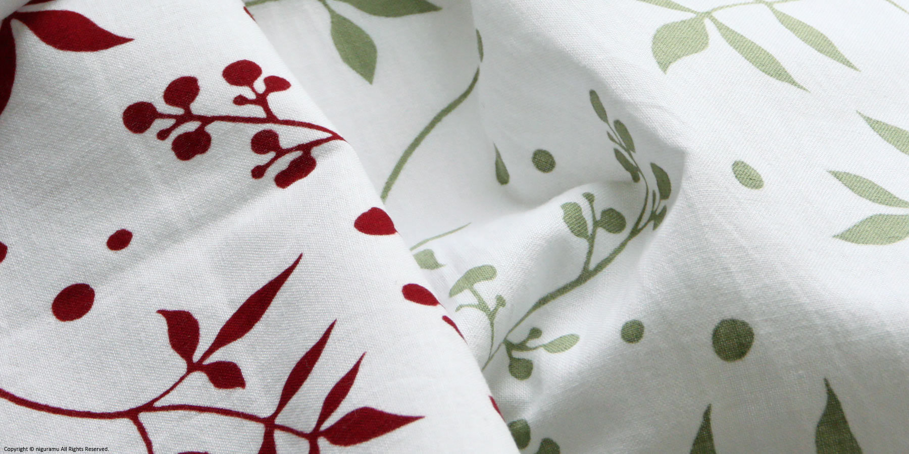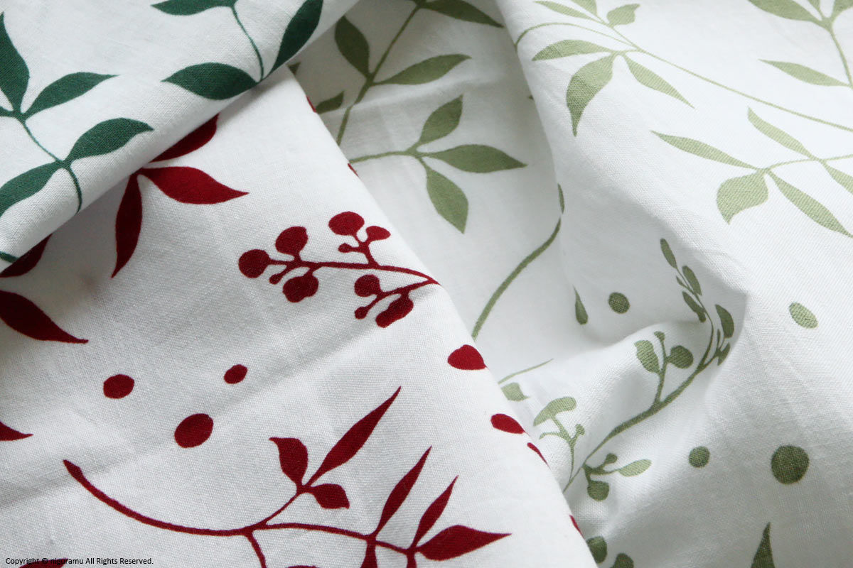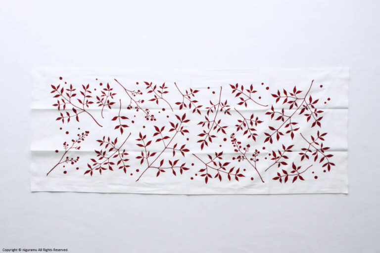 作者の自宅に咲いている木をモチーフにデザインされた柄で、身近で育てた南天への愛を感じるデザインです。