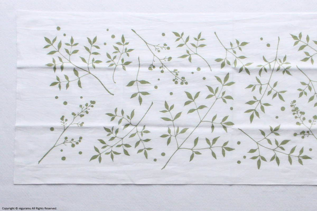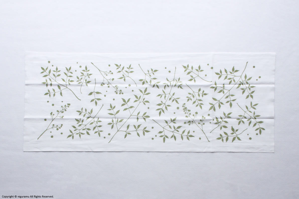 • 注染(ちゅうせん)という「型を使って布に防染糊を置き、たたんだ生地の上から染料を注ぐ」という方法で染められています。染めの特性上、若干の色ムラや柄のにじみがあります。