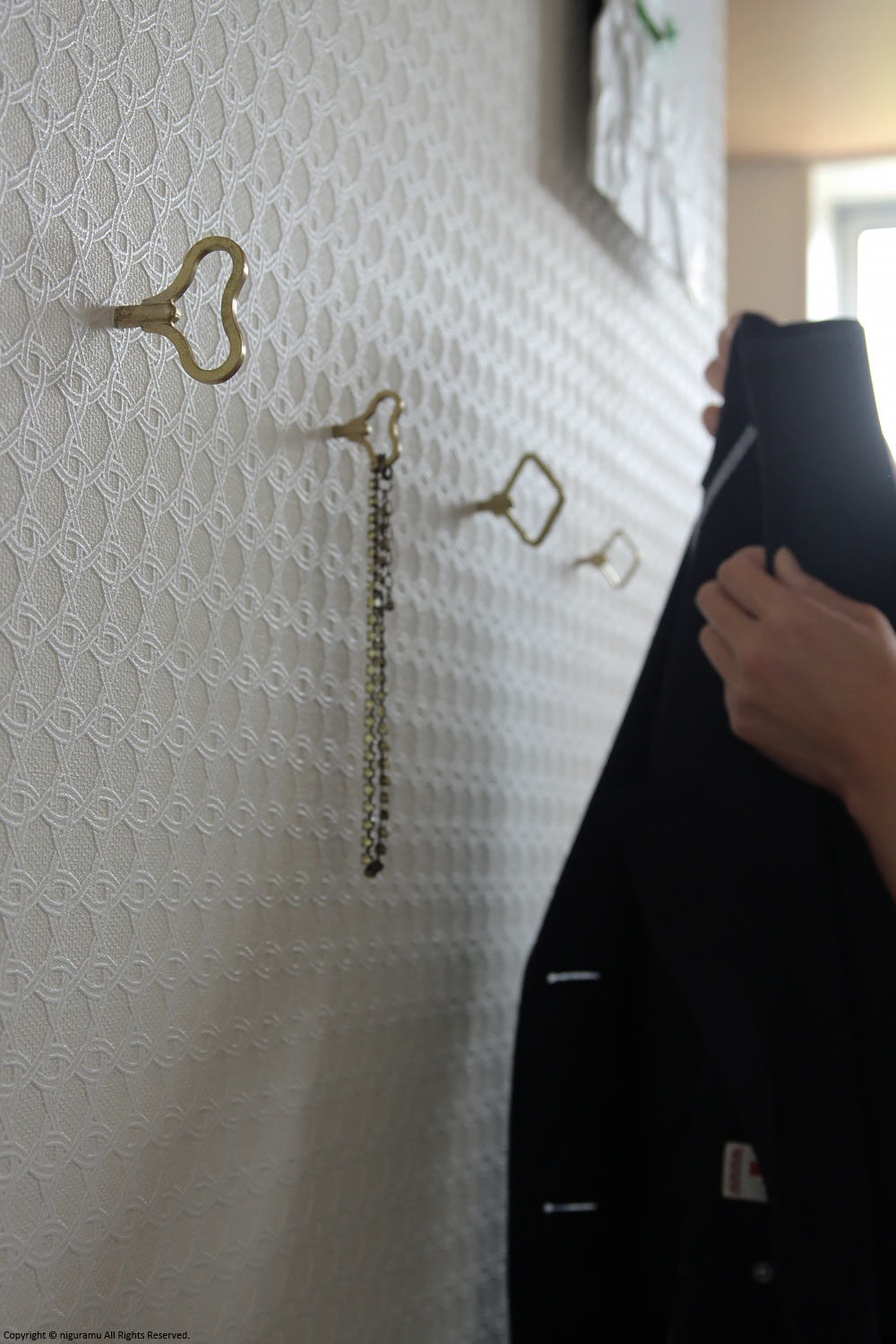 - フックを取り付ける場所は、しっかりした木製下地のある場所で使用して下さい。石膏ボードや薄い木板には取り付けできません。
