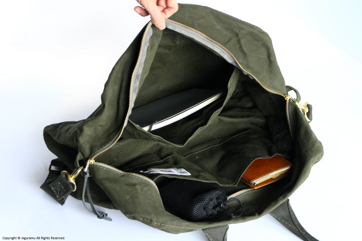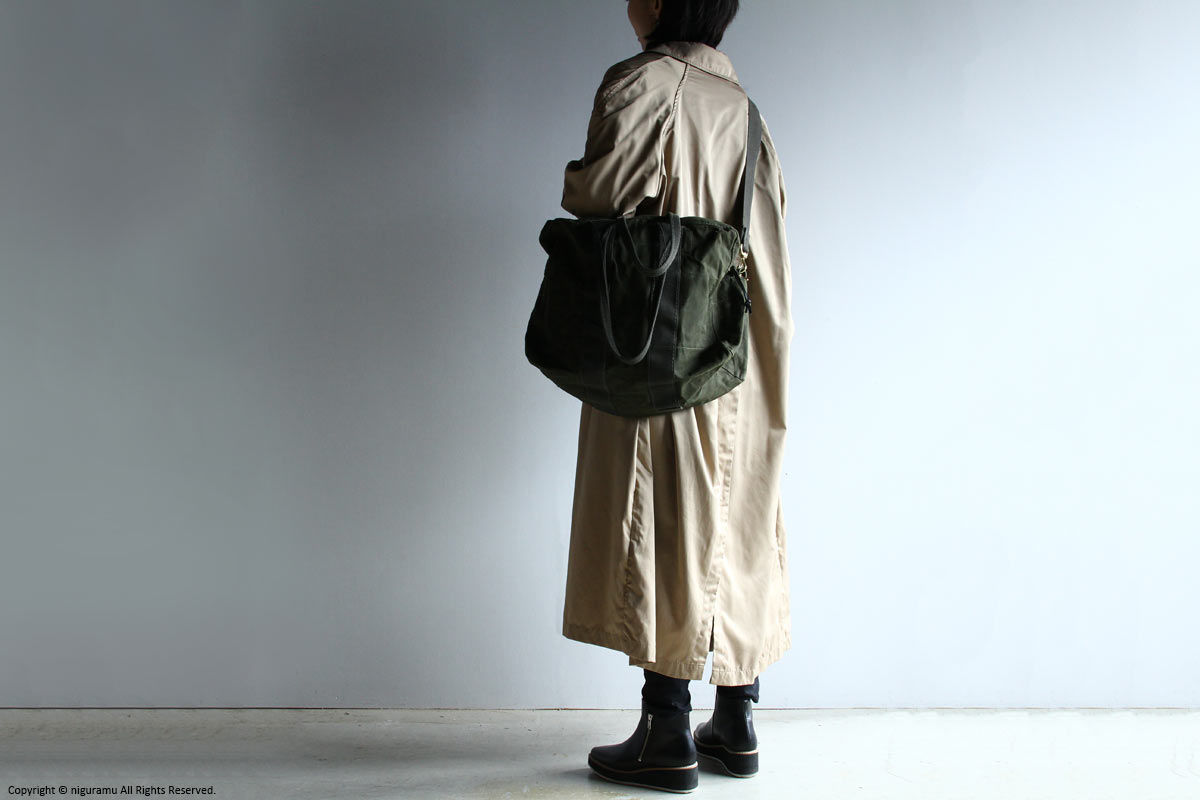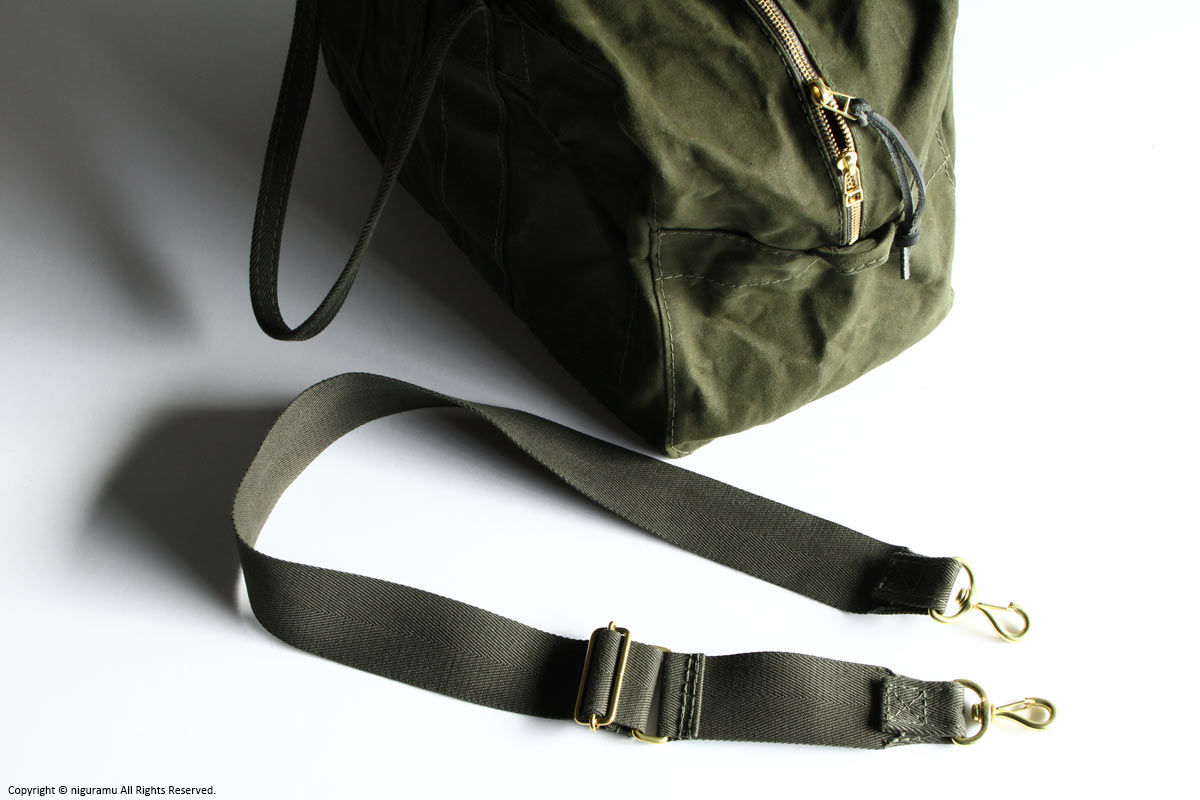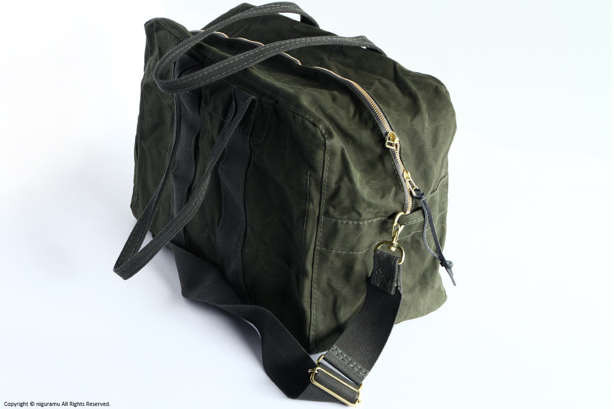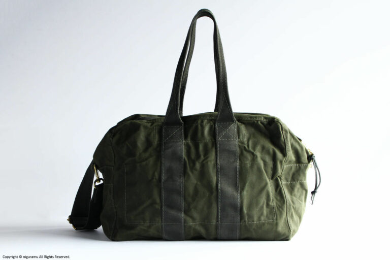 バッグ部分は10号帆布にパラフィン加工を施した防水性を高めた独特のハリとしっとりした質感の特殊生地を使用。持ち手は1本の特注ヘリンボンテープでぐるりと全体をかかえた丈夫な作りです。