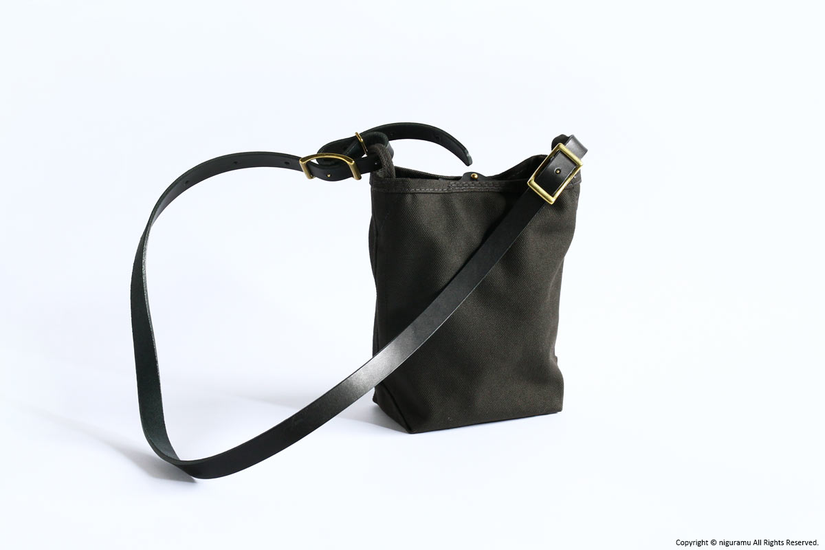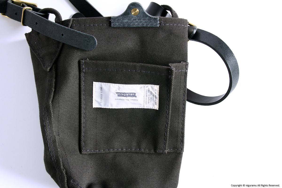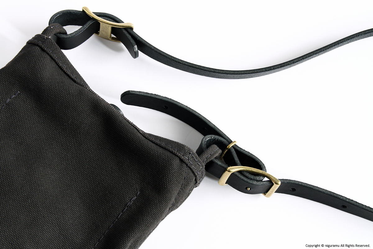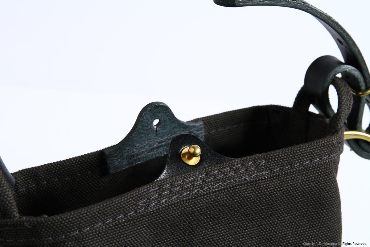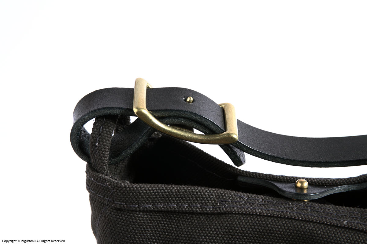 | 材質 | 倉敷帆布4号, 牛革 (ショルダーストラップ, スナップ), 真鍮 (バックル, ギボシ) |