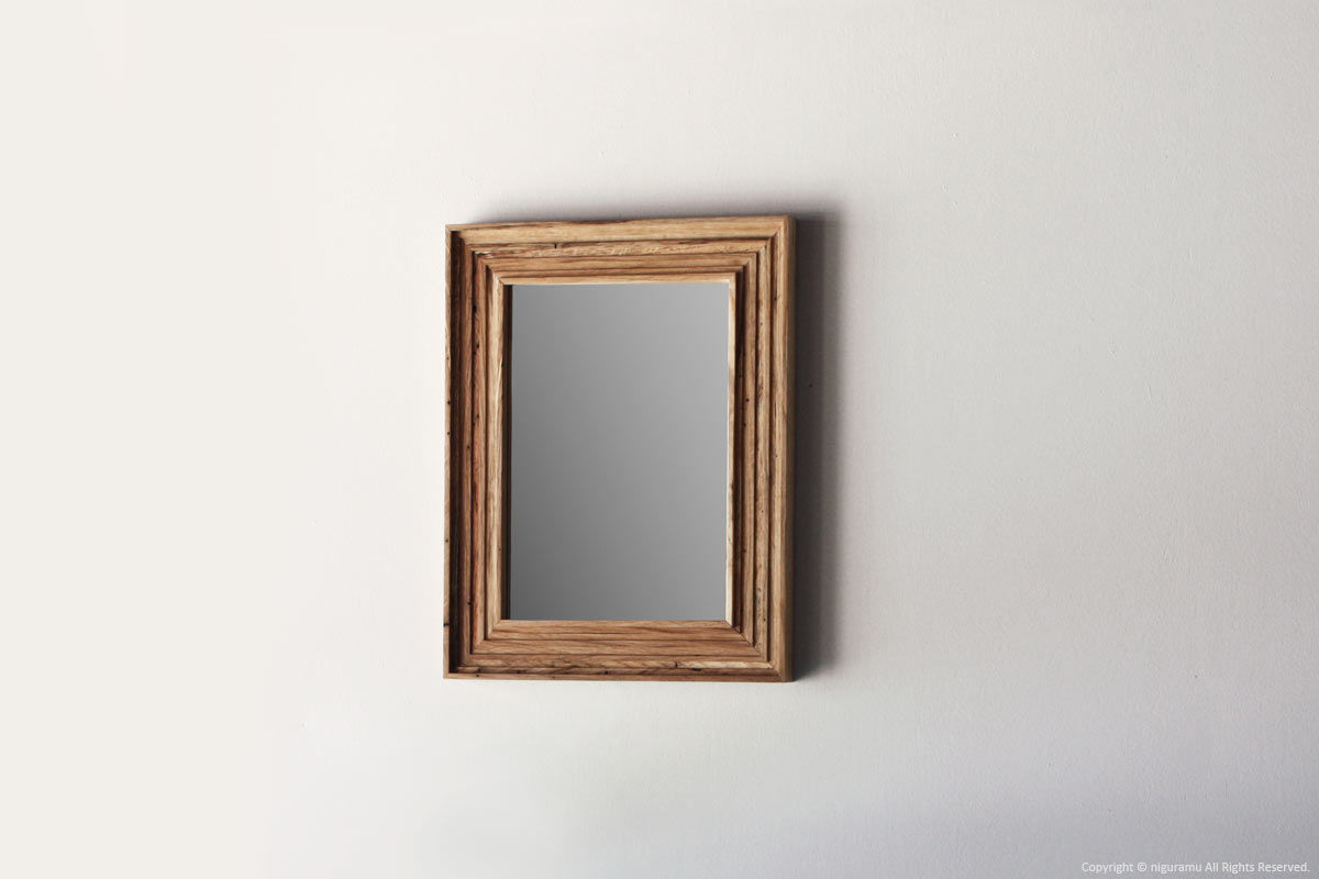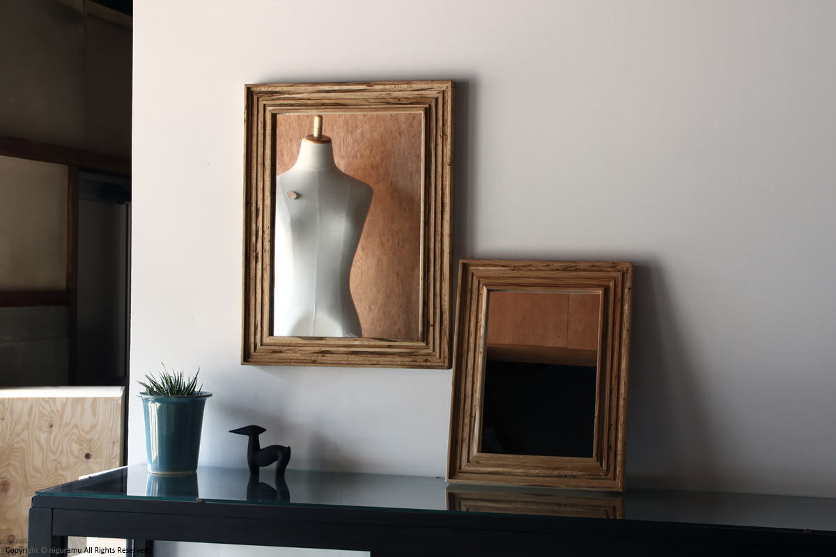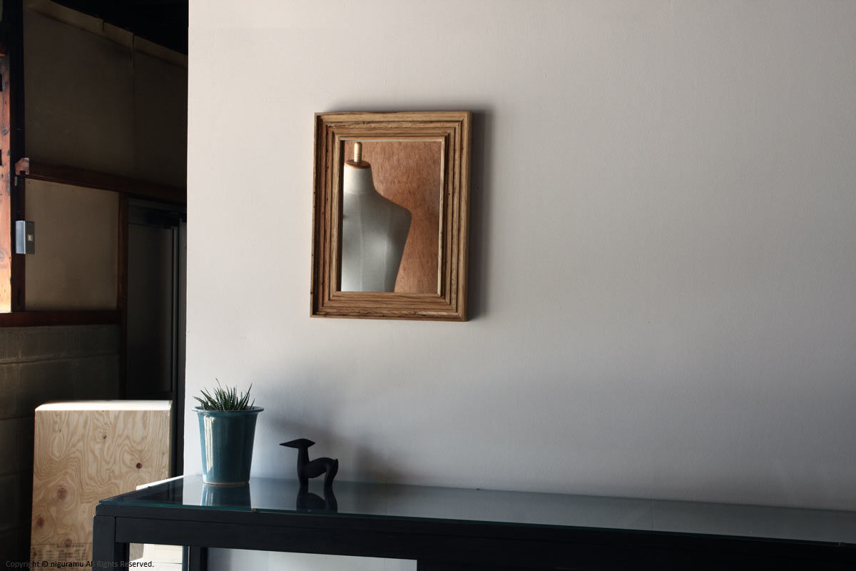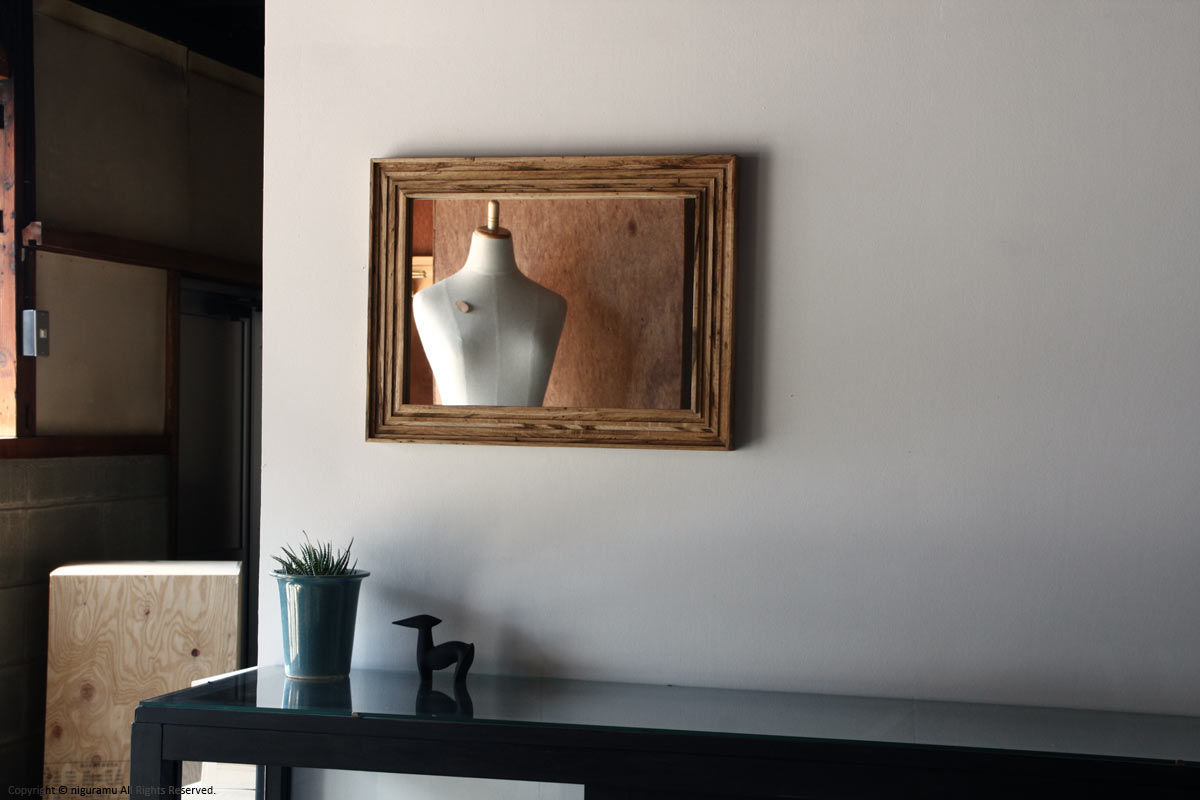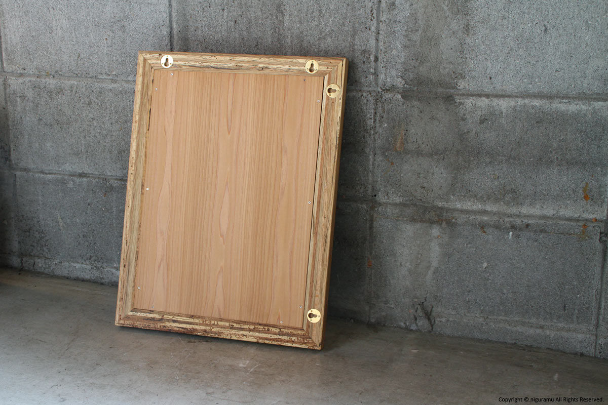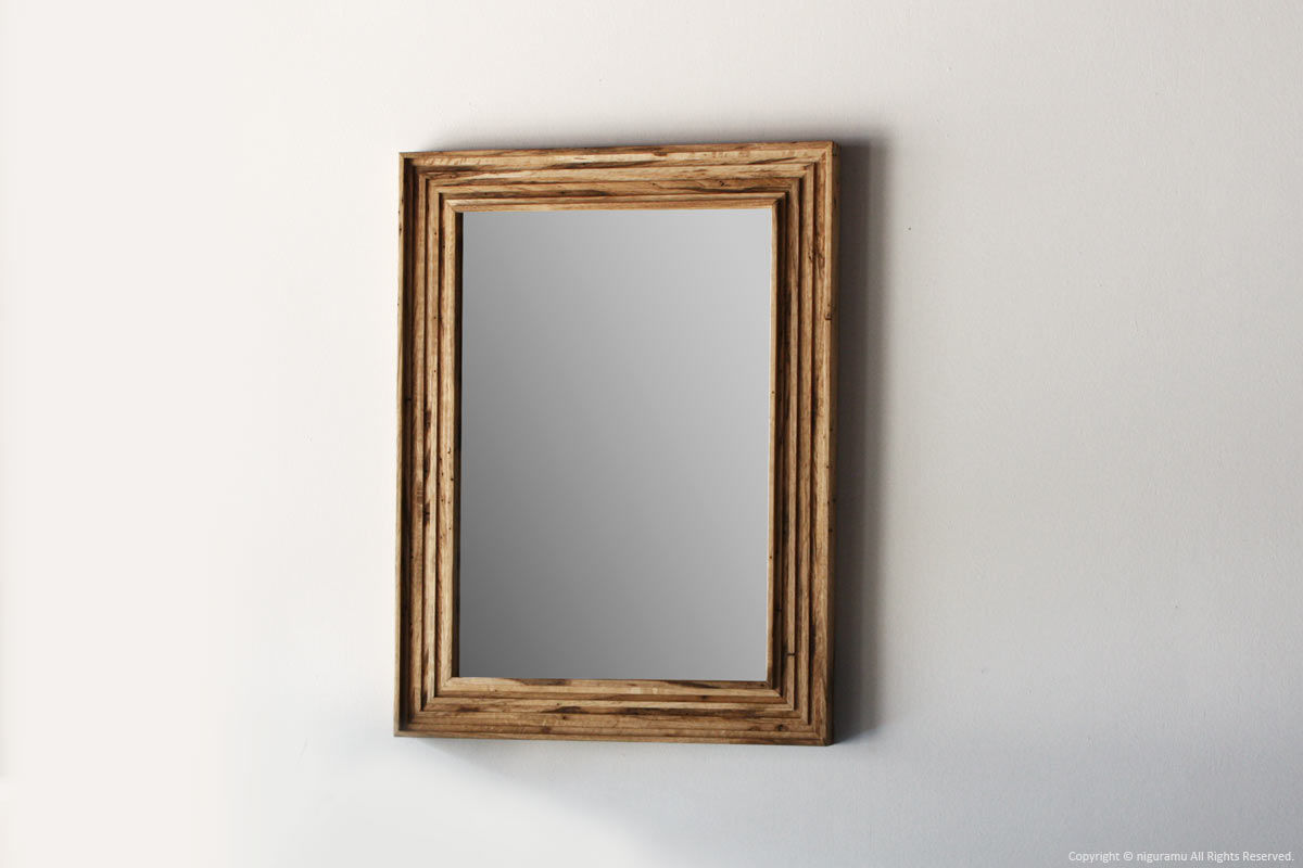 虫喰い材の表情を楽しむため、太いフレームを組んで作った壁掛けミラー。何枚もの板を重ねる事により木材の濃淡や虫喰いの表情がより複雑になった、シンプルながらも重厚感のある壁掛け鏡です。縦、横の2方向対応。