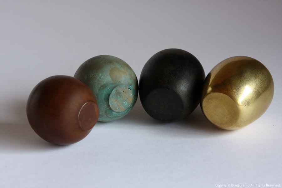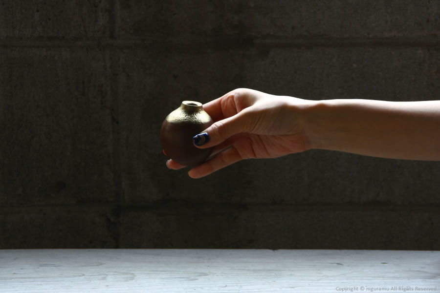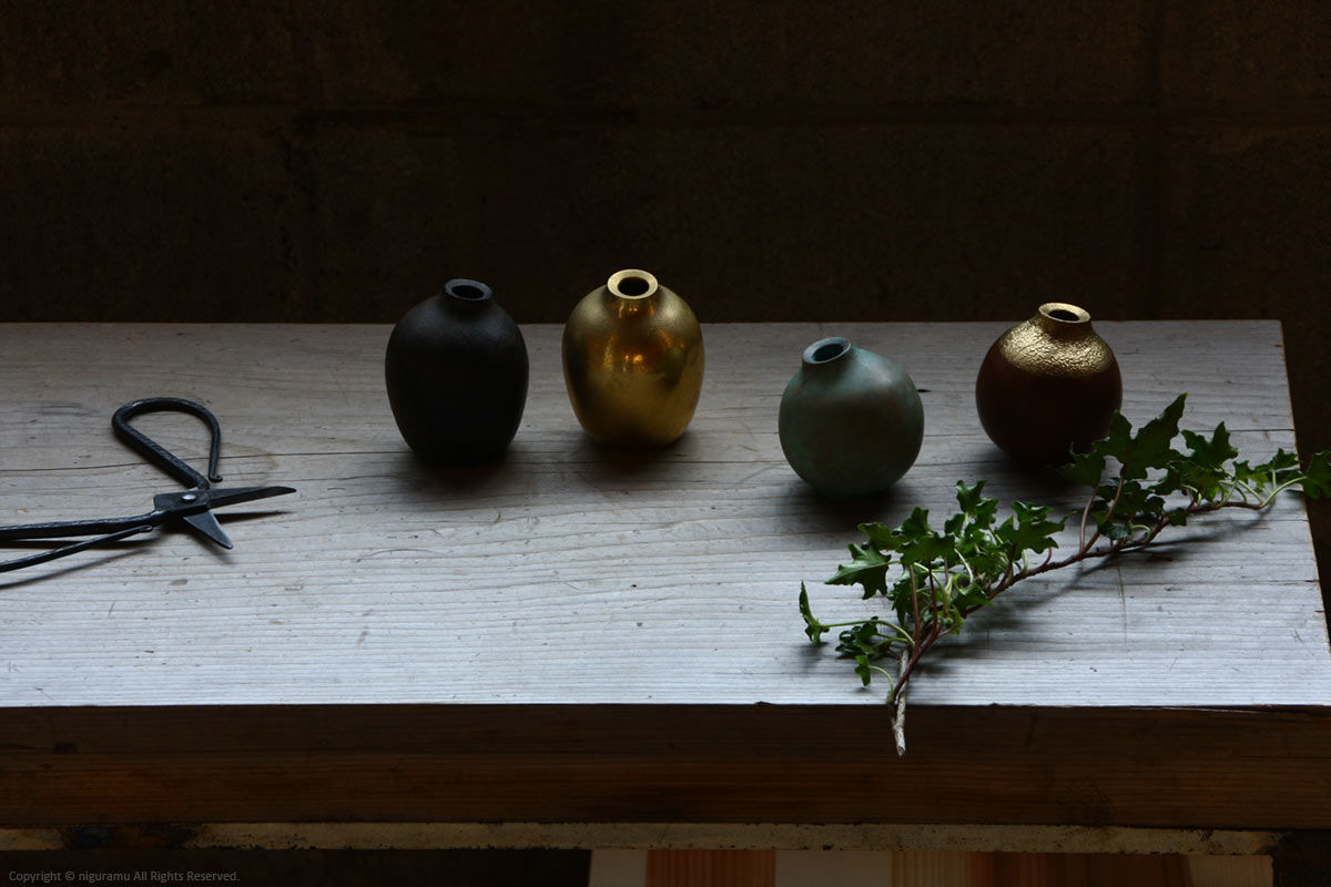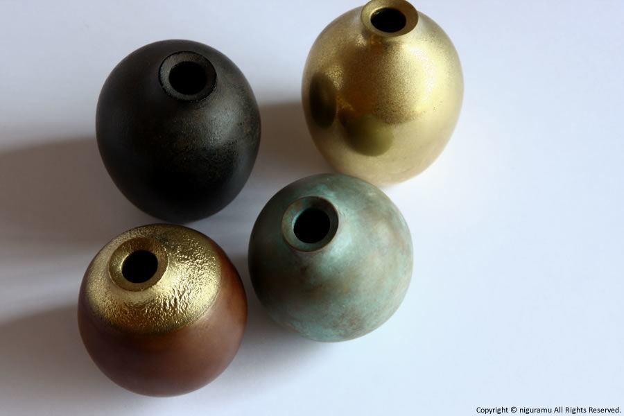 「S/朱」は挿し口の周りを磨き金色に、その他を朱、茶色位に金属発色させてあります。ドングリのような球根のような面白い一輪挿しに挿した草花は、まるでそこから成長してきたように見えます。