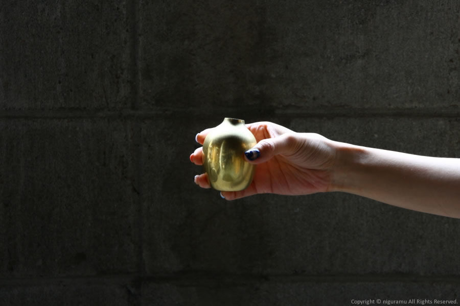 「ひょっとこ」名づけられた、口が少し傾いた小さな一輪挿し。斜め弧を描く花や、ツタ属には斜めについた花瓶の口が自然になじみます。多少大きな花でも真鍮製の花瓶で重いため、倒れにくくなっています。