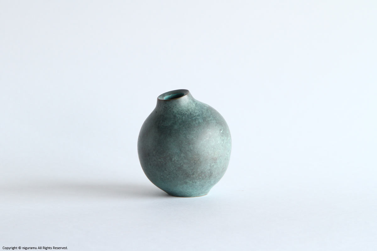 シンプルな形ですが、口が少し傾いた丸い花瓶が、金属という固いイメージを連想させずユーモラス。