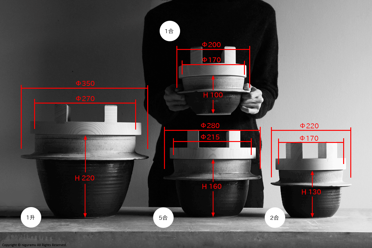 羽釜本体: 170"diam (220"OD) × 130"H mm 木フタ: 185"diam × 75"H mm 総重量: 1840 g |