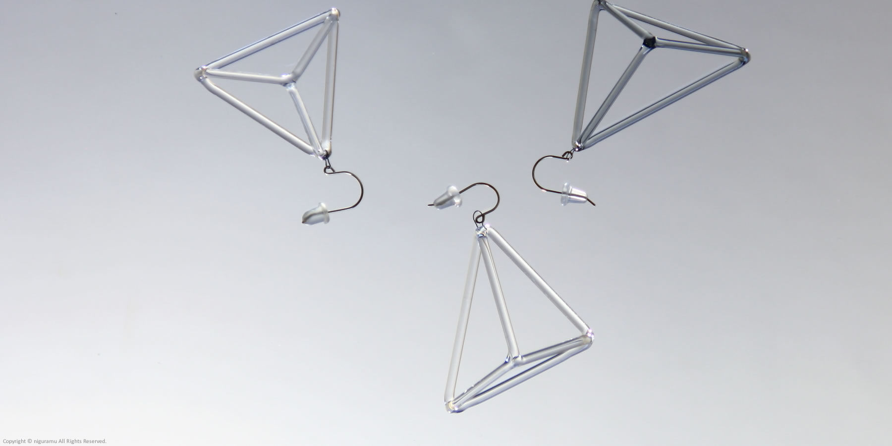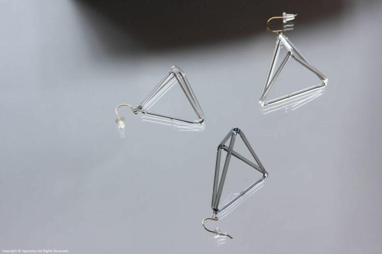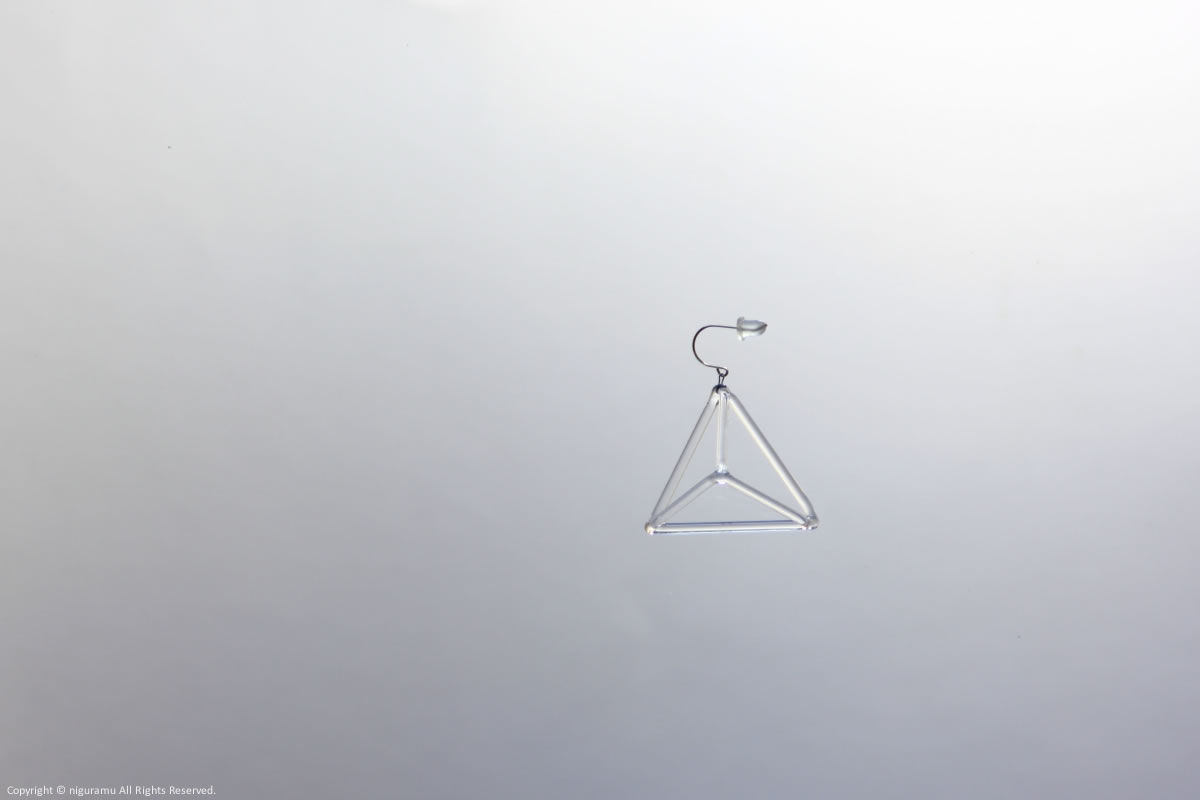 ガラス棒を三角錐につなげたピアスイアリング。