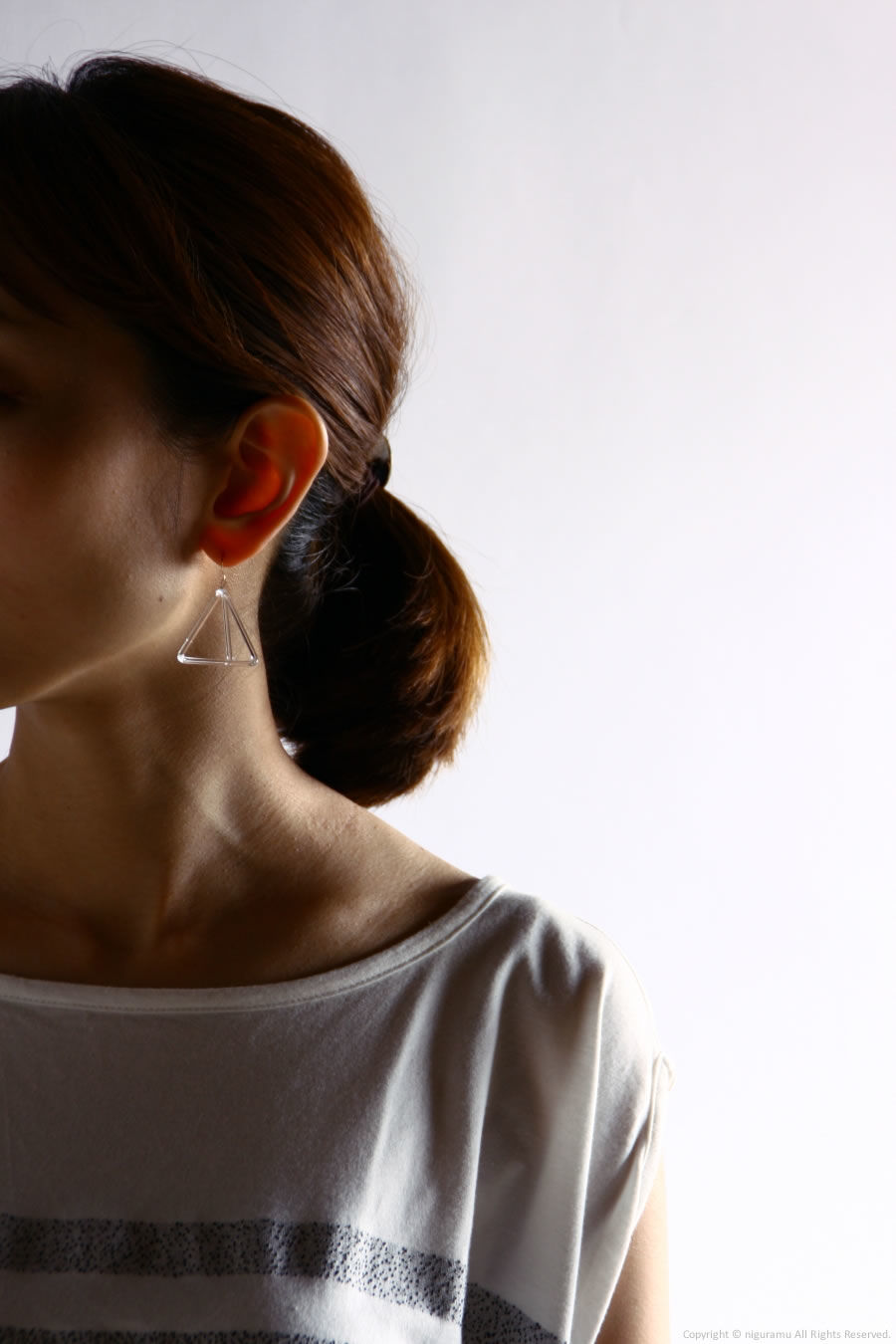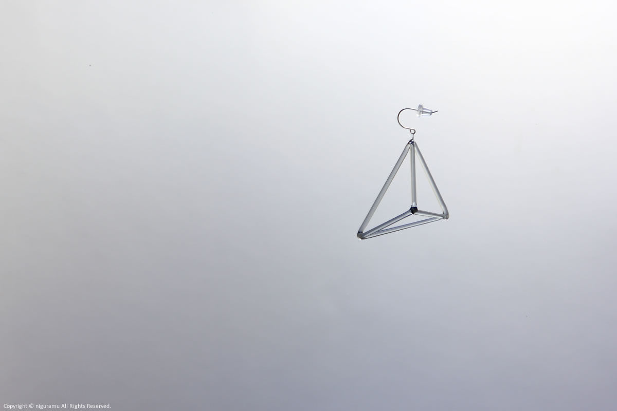 最小の頂点で作られる立体であるトライアングルピラミッド(三角錐)。何かが動き始まりそうな、魅力的で神秘的な形のイアリングです。空間の体積はありますが、線で作られていること、ガラスの透明感によって軽い感じに見えます。(片耳売り)