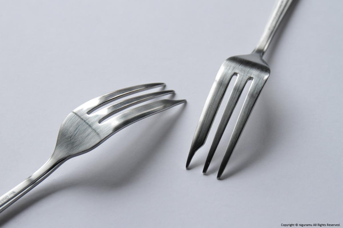 ケーキフォークは、爪片側を角度をつけた刃のような形状にしてケーキを切りやすくしています。