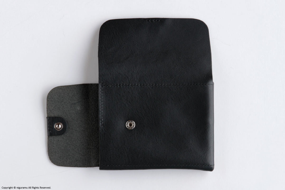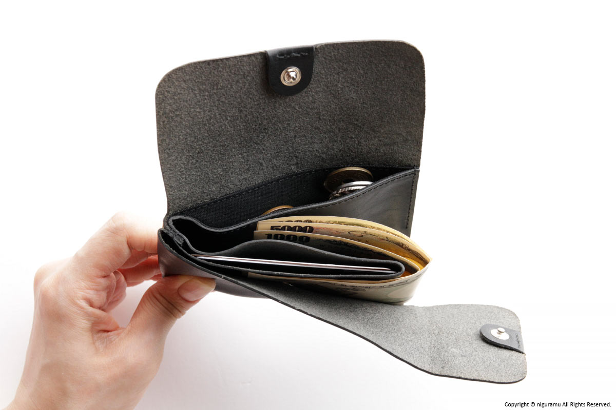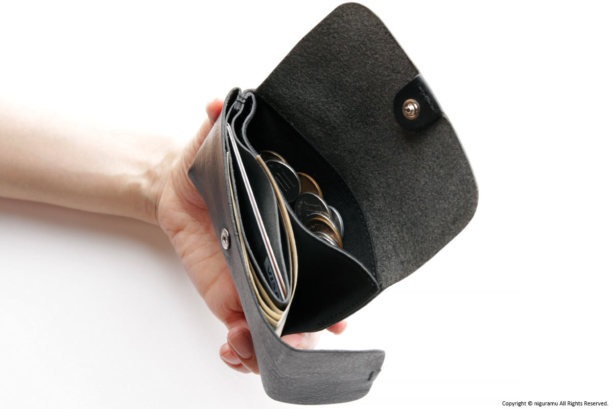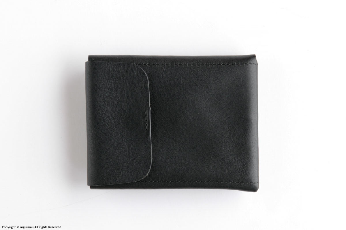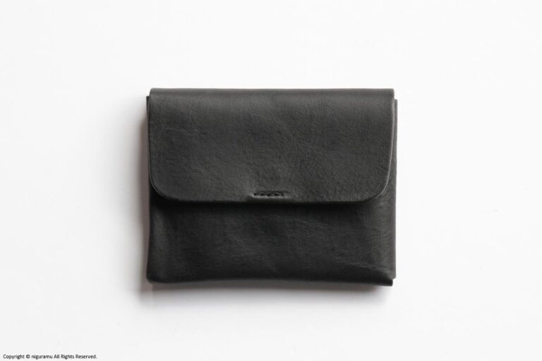 植物性タンニンのみで鞣された高品質の革「シュリンクレザー」を使用した、表と裏にフラップがある小さな財布。