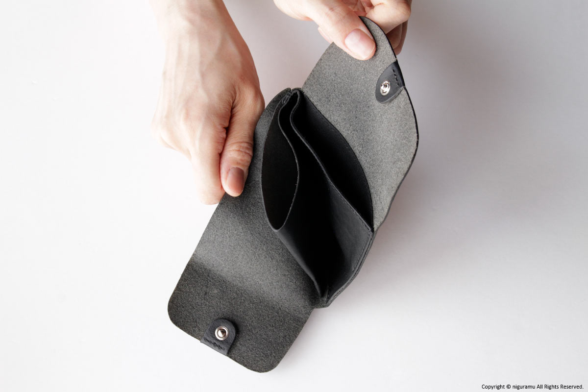 表のフラップを開けると小銭とカードが取り出せます。コインポケットは枚数を確認しやすい深さ40mm。表フラップを開けたまま裏フラップを外すとお札が取り出しやすくなる仕様です。