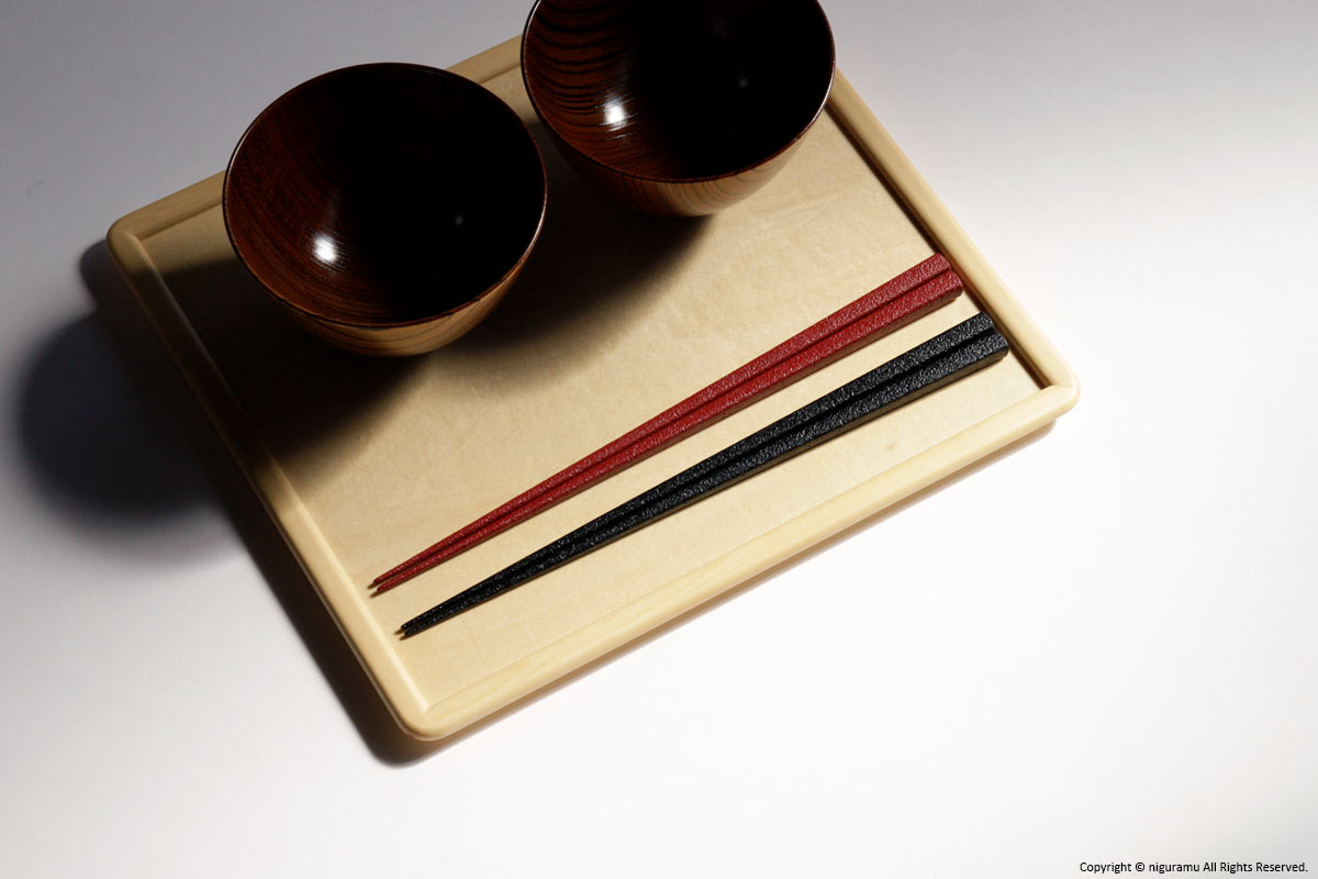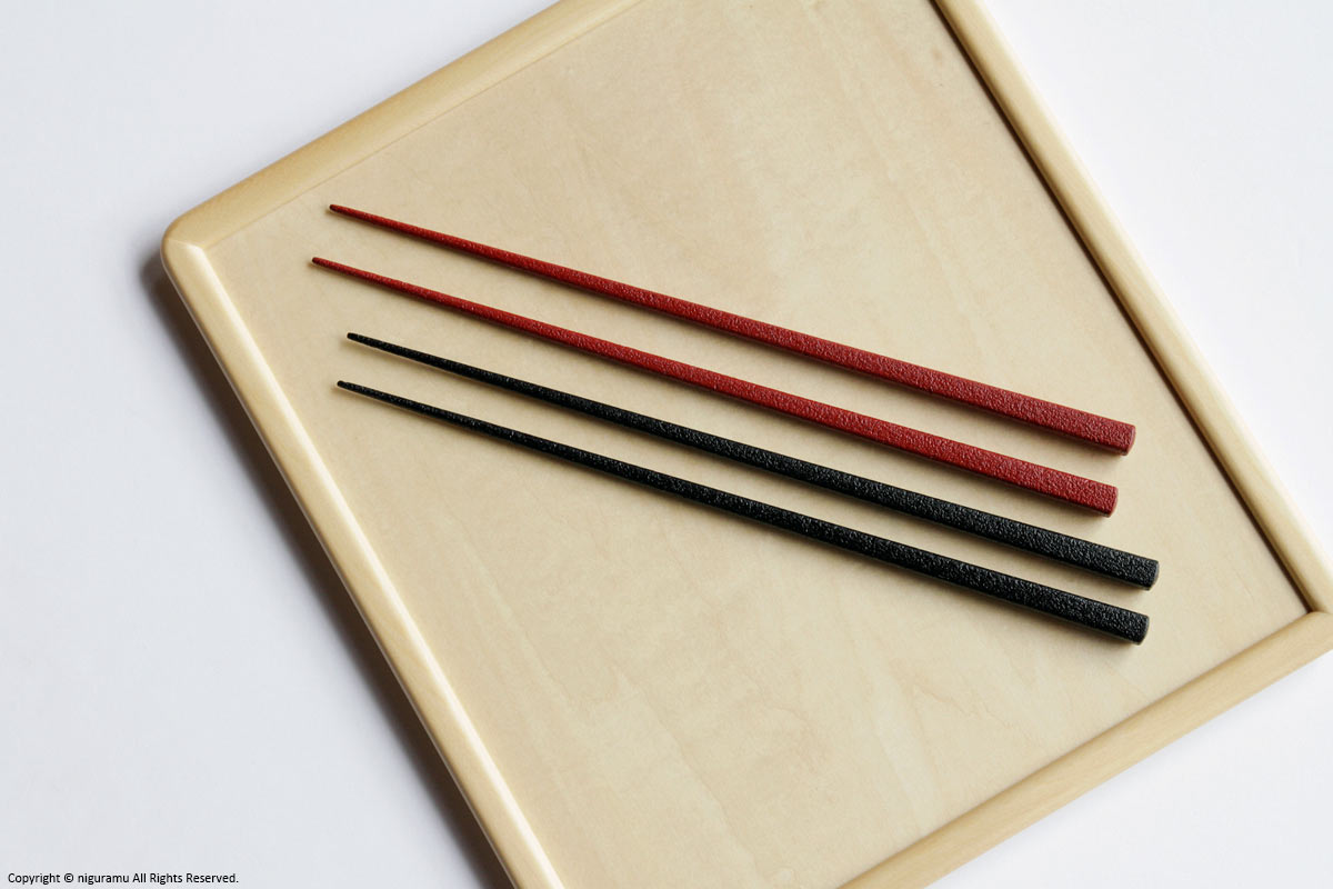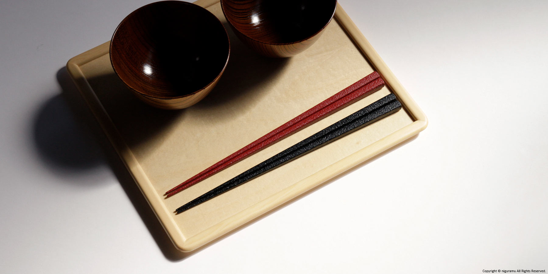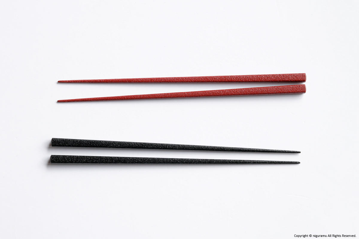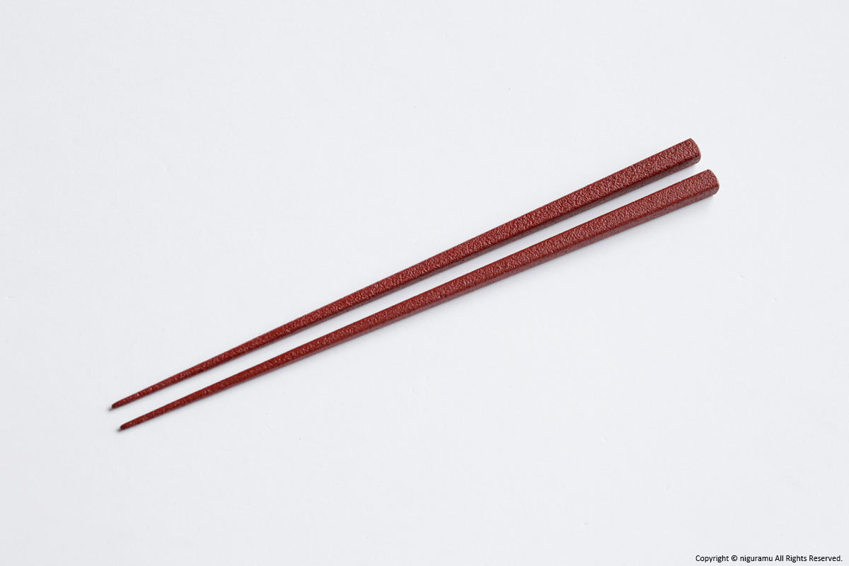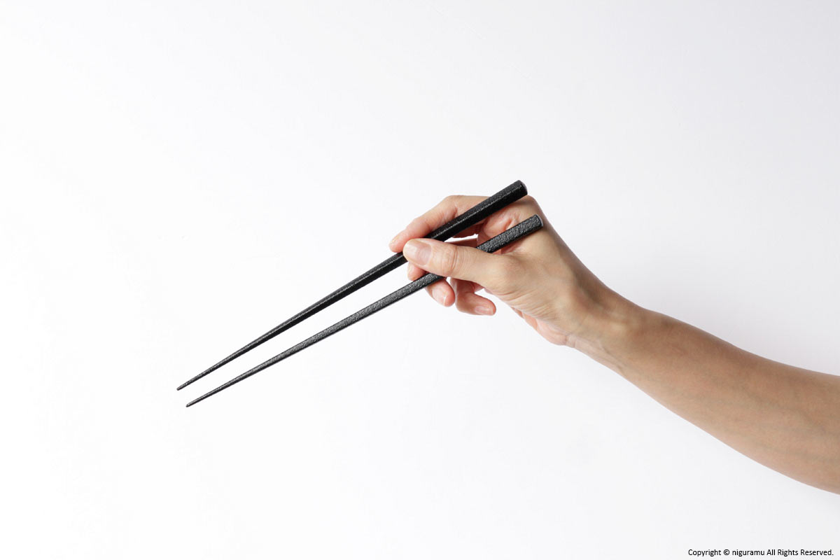蒔地は、漆を塗って乾かないうちに砥粉などを蒔いて付着させる漆技法で、ざらりとした表面は食材がつかみ易く、そして傷が目立ちにくいため、普段使いに最適な箸となっています。